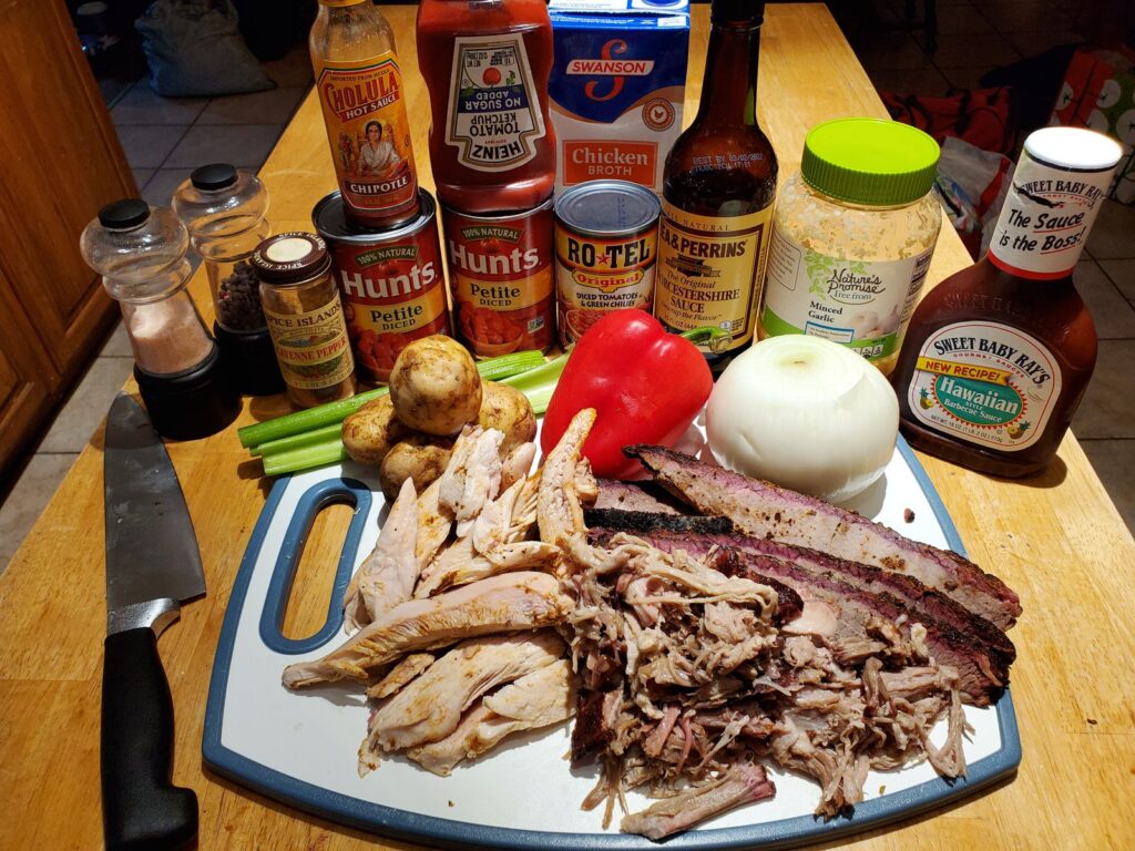 - Chop onion, red pepper, celery, potatoes, and all cooked meats into bite-sized pieces.1 large yellow onion, 1 red bell pepper, 3 celery stalks, 1 lb smoked chicken, 1 lb brisket, 2 cups diced potatoes, 1 lb pulled pork