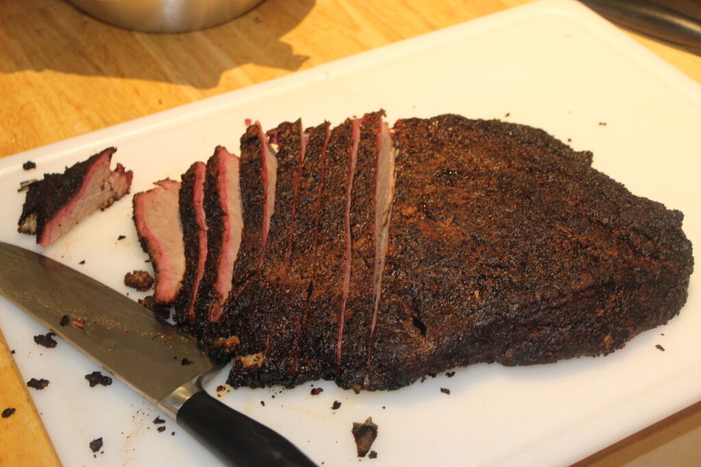 Unwrap your brisket and place it on a cutting board. Start by slicing against the grain through the flat section. Once you reach the point, you’ll notice the grain changes direction — rotate the brisket 90 degrees and continue slicing.