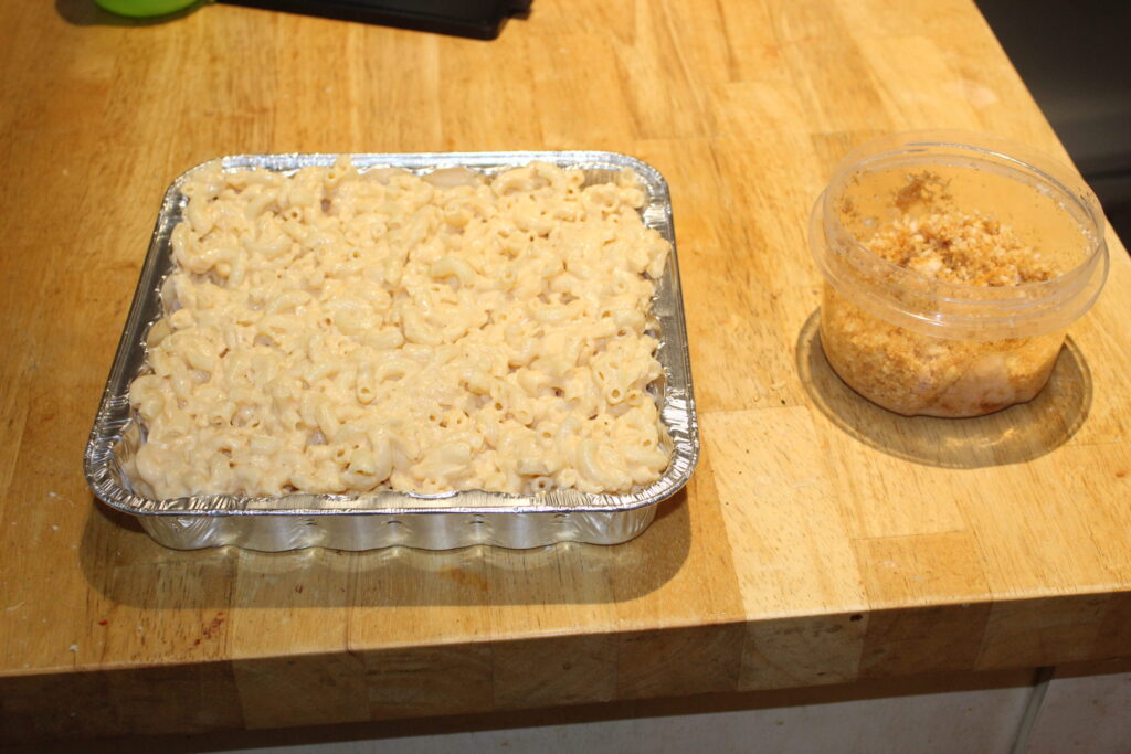 Stir the cooked pasta into the cheese sauce and pour it into an aluminum pan (or cast iron if you want to get fancy). Melt butter, mix it with panko, parmesan, and your rub, then sprinkle it evenly over the top.