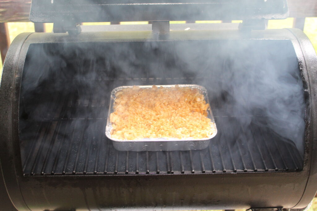 Preheat your smoker to 225°F and use a mild wood (fruit woods work great; hickory is fine too). The prep is simple: cook the pasta, make the cheese sauce, mix it together, add the topping, and let the smoker do its thing.