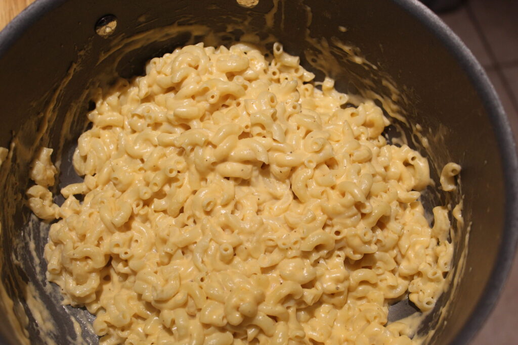 Cook the macaroni, then build a roux (butter + flour). Whisk in the half and half slowly, then melt in the cream cheese, cheddar, and smoked gouda. Add mustard powder and cayenne for a little kick and depth.